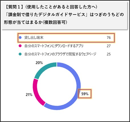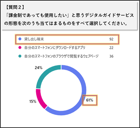 アンケート調査の結果、課金制の音声ガイドサービスを利用した経験がある人のうち、約6割が「貸出型端末」のガイドシステムを利用していたことが分かりました。また、課金制であっても利用したいと考えるデジタルガイドについては、約6割が「貸出型端末」を選択しました。いずれの質問においても、「貸出端末」か「利用者が所有する端末を利用する方式」を回答の選択肢として設けていますが、両方の質問において「貸出端末」に回答が集中している点が特徴的です。