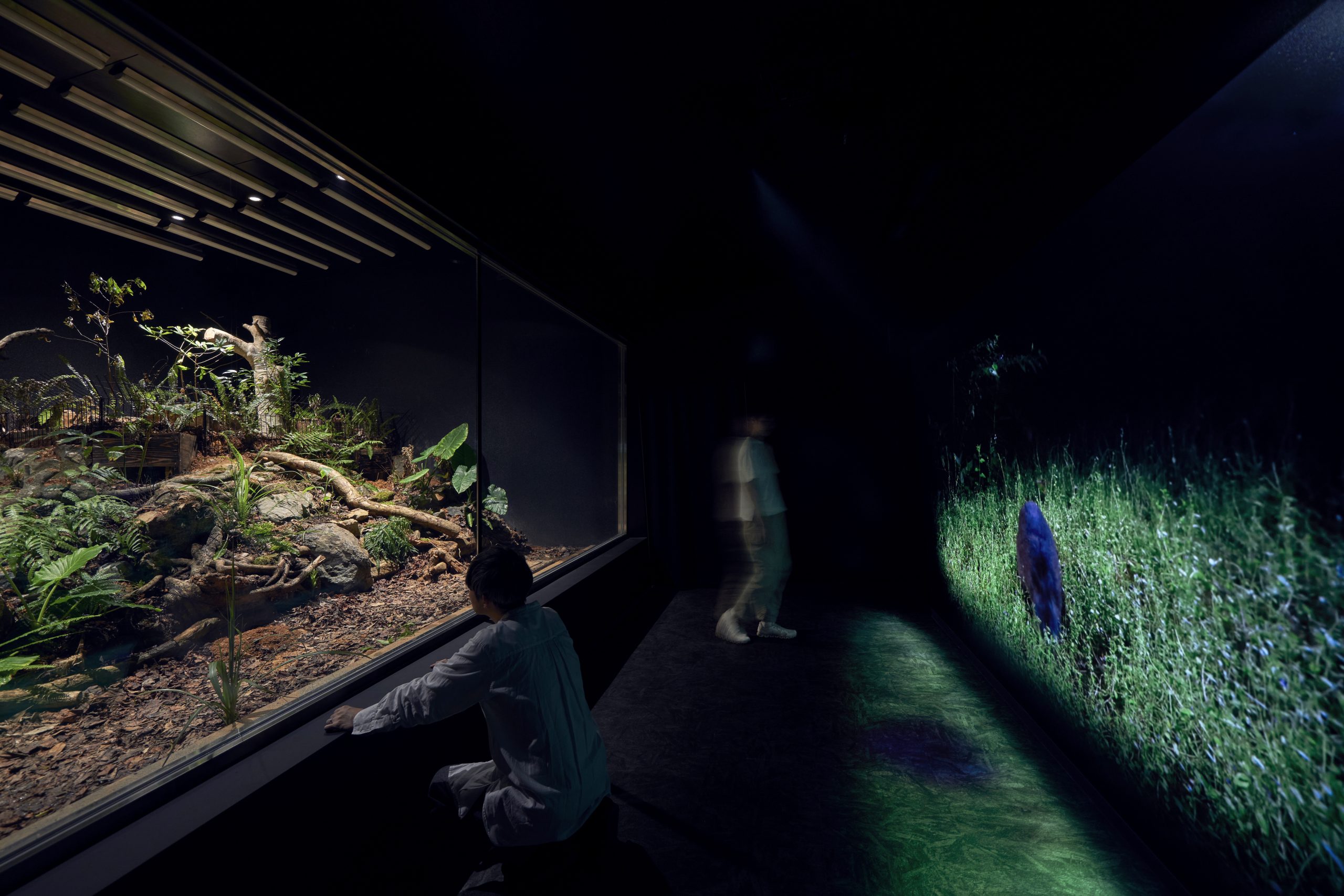 Here, visitors can experience the adventure of a night forest on the scale of a rabbit. They will be startled by cars that suddenly appear and huge predators, and will push aside plants and flowers taller than themselves in search of forest creatures that react to the black light. The facility is designed to encourage visitors to see the rabbits' perspective, becoming aware of their feelings and fears and fostering empathy. Furthermore, by fully opening the treatment room for rescued rabbits to the public, visitors are presented with the reality of injuries sustained in traffic accidents and other accidents. Surrounded by the nature of Amami Oshima, the facility will watch over rescued rabbits until they are released back into the wild, and will encourage them to think about the coexistence of humans and rabbits.