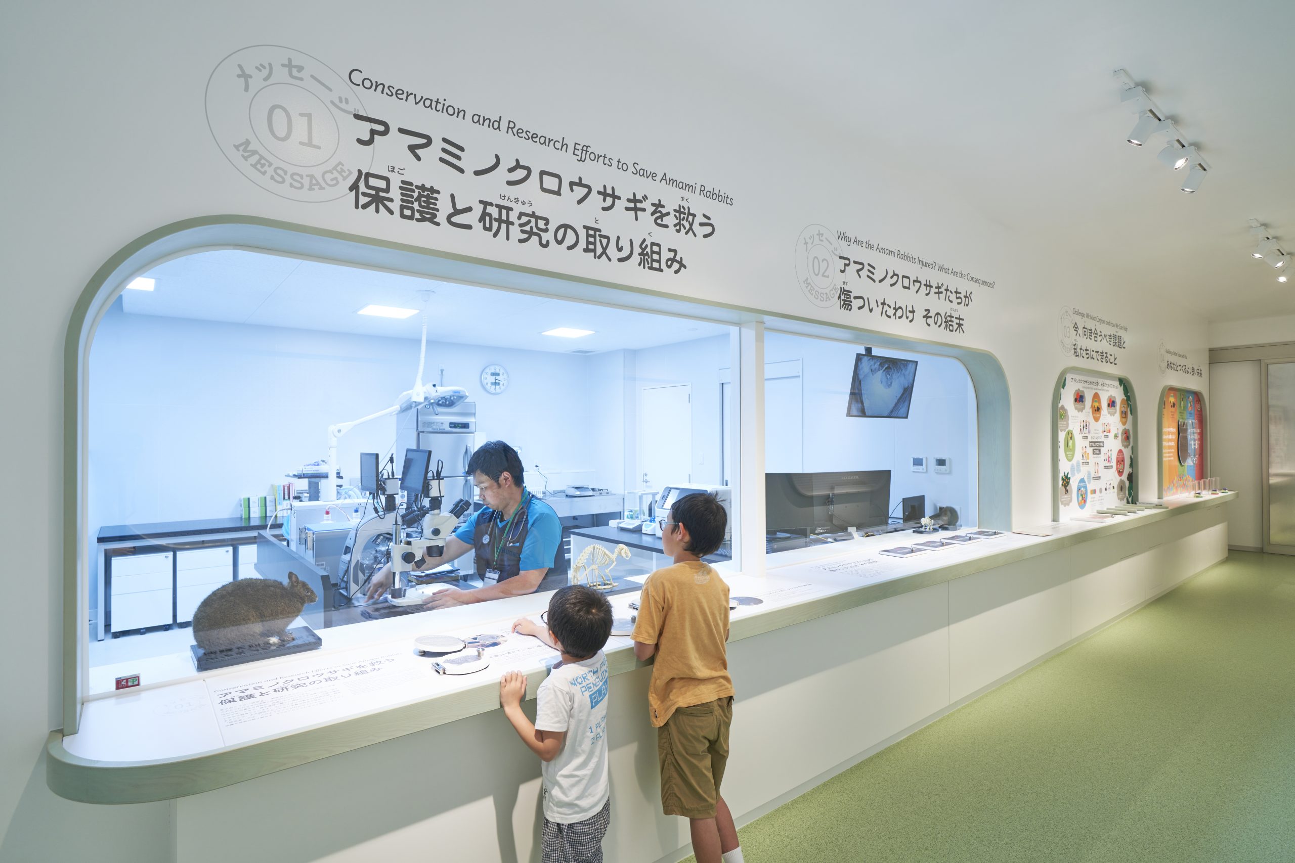 The greatest feature of this facility is that it allows children to explore the Amami night forest, which has been expanded and reconstructed five times larger than usual to give them a firsthand experience of the scale of rabbits. As they push through plants and flowers taller than themselves in search of forest creatures, they experience the fear of sudden cars and large predators from a rabbit's perspective, giving them an opportunity to think about the threats rabbits face, such as roadkill and feral cats, as something that affects them personally. In addition, the treatment room for rescued rabbits is fully open to the public, providing a place where visitors can see the injured and bleeding rabbits in their natural state.